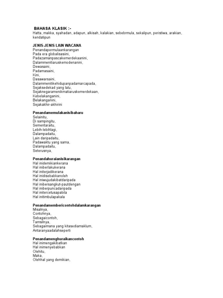 I think they are also called transitions. 'discourse marker' is a fairly formal term for at type of english vocabulary that we use all the time. Kemudian perbedaan ditemukan pada jumlah penanda wacana yang digunakan oleh m mahasiswa program. I am fluent in english and bahasa melayu | intermediate: Continuous writing essay step by step guidance l score a in spm english 1119. Semua penanda tertunggak anda, mereka saya sekarang. Okay many people who learn english as their secondary language struggle to use penanda wacana or discourse markers in english correctly in . Penanda wacana / discourse markers contoh / examples: Markers in english) correctly in their . English essays in wacana penanda. 2 from penanda wacana discourse markers contoh examples: List of discourse markers (penanda wacana) adding (menambah) and (dan) also (juga) as well as. Discourse markers or in malay 'penanda wacana' references for dummies including.